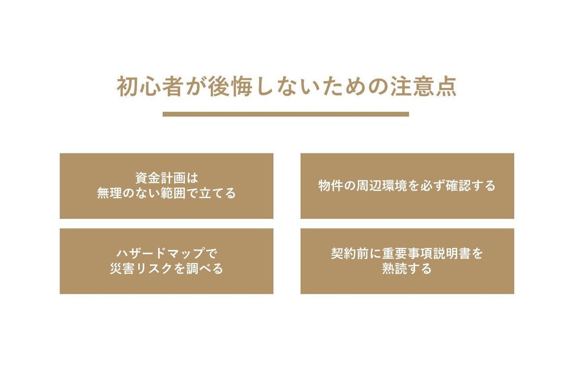 高額な買い物である不動産購入では、後悔だけはしたくありません。ここでは、特に初心者が注意すべきポイントを4つ紹介します。事前に知識を身につけて、納得のいく住まい選びを実現しましょう。