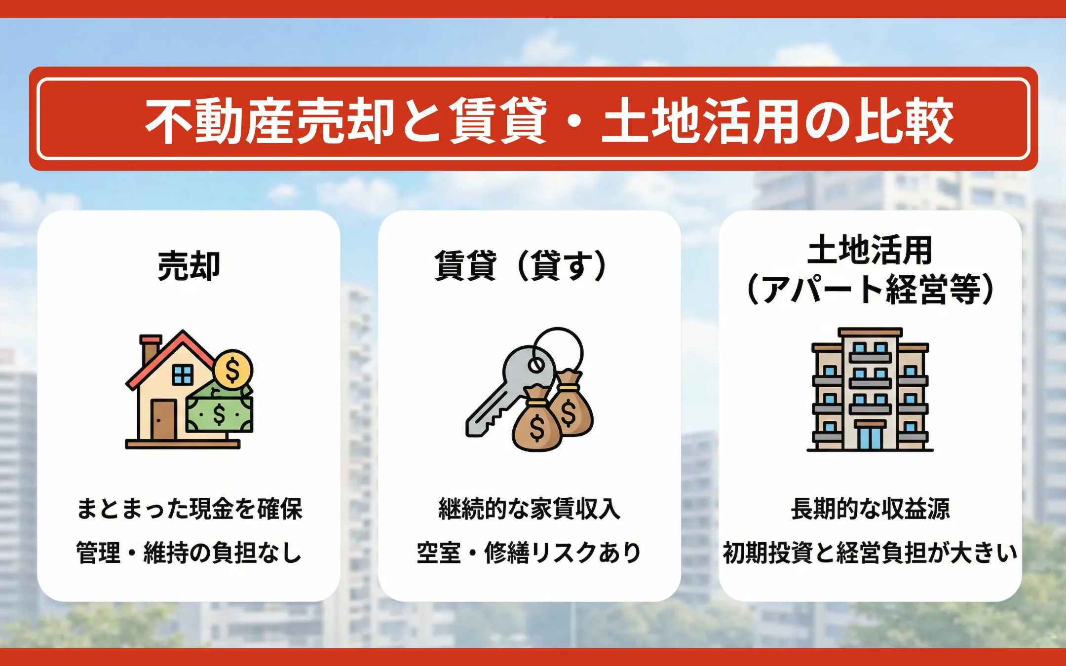 不動産の出口戦略は売却だけではありません。「賃貸」や「土地活用」と比較し、ご自身の目的(キャッシュ確保か、継続収入か)に合った手段を選びましょう。