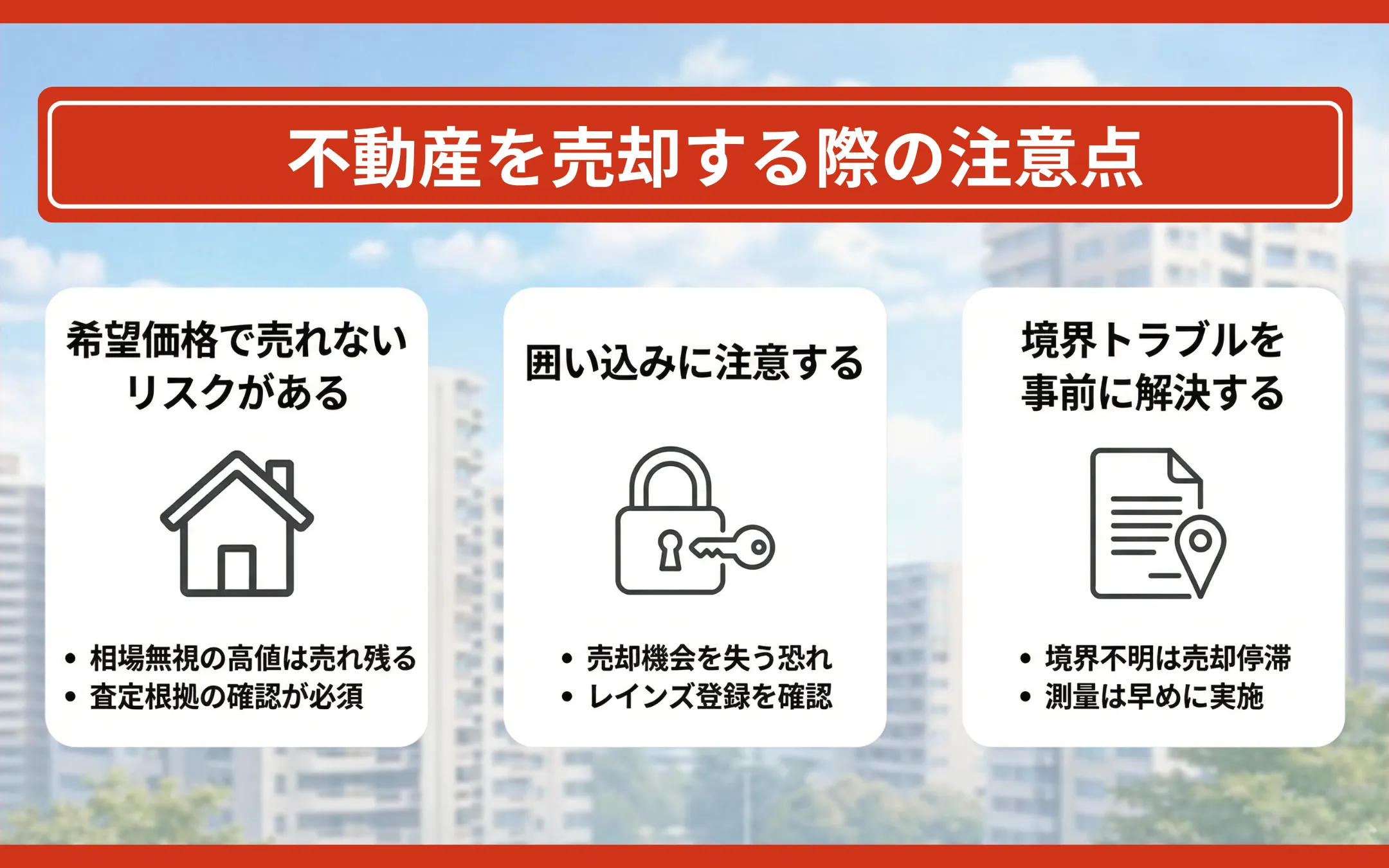 売却活動には、資産価値を損なうリスクや、不動産取引特有のトラブルが潜んでいます。こうした事態を未然に防ぐための対策を解説します。