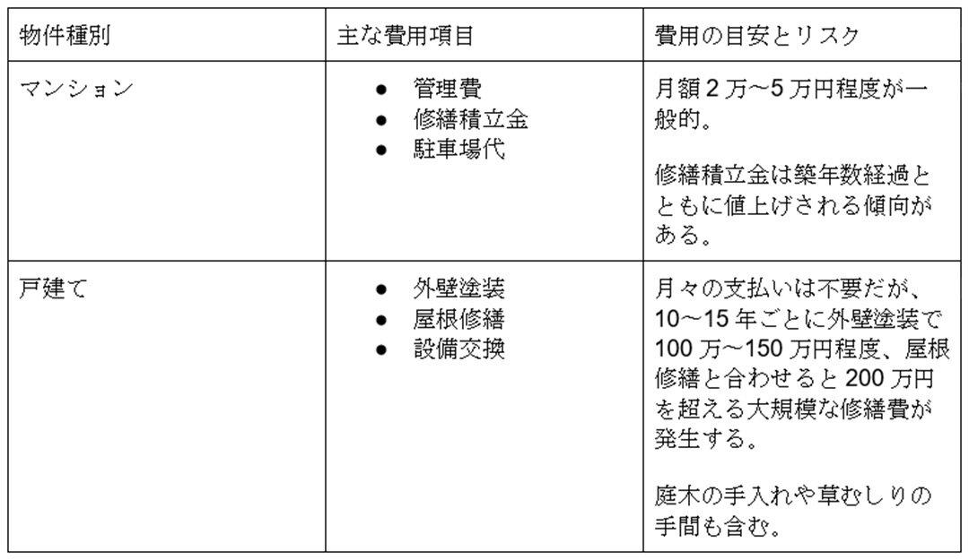 物件種別ごとの主な維持費は以下のとおりです。