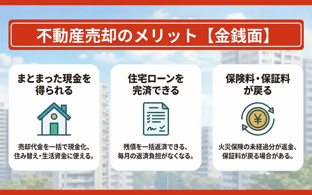 不動産売却の主なメリットは、売却益の現金化に加え、ローン完済や保険料の返戻(へんれい)など、複数の金銭的リターンを得られる点にあります。