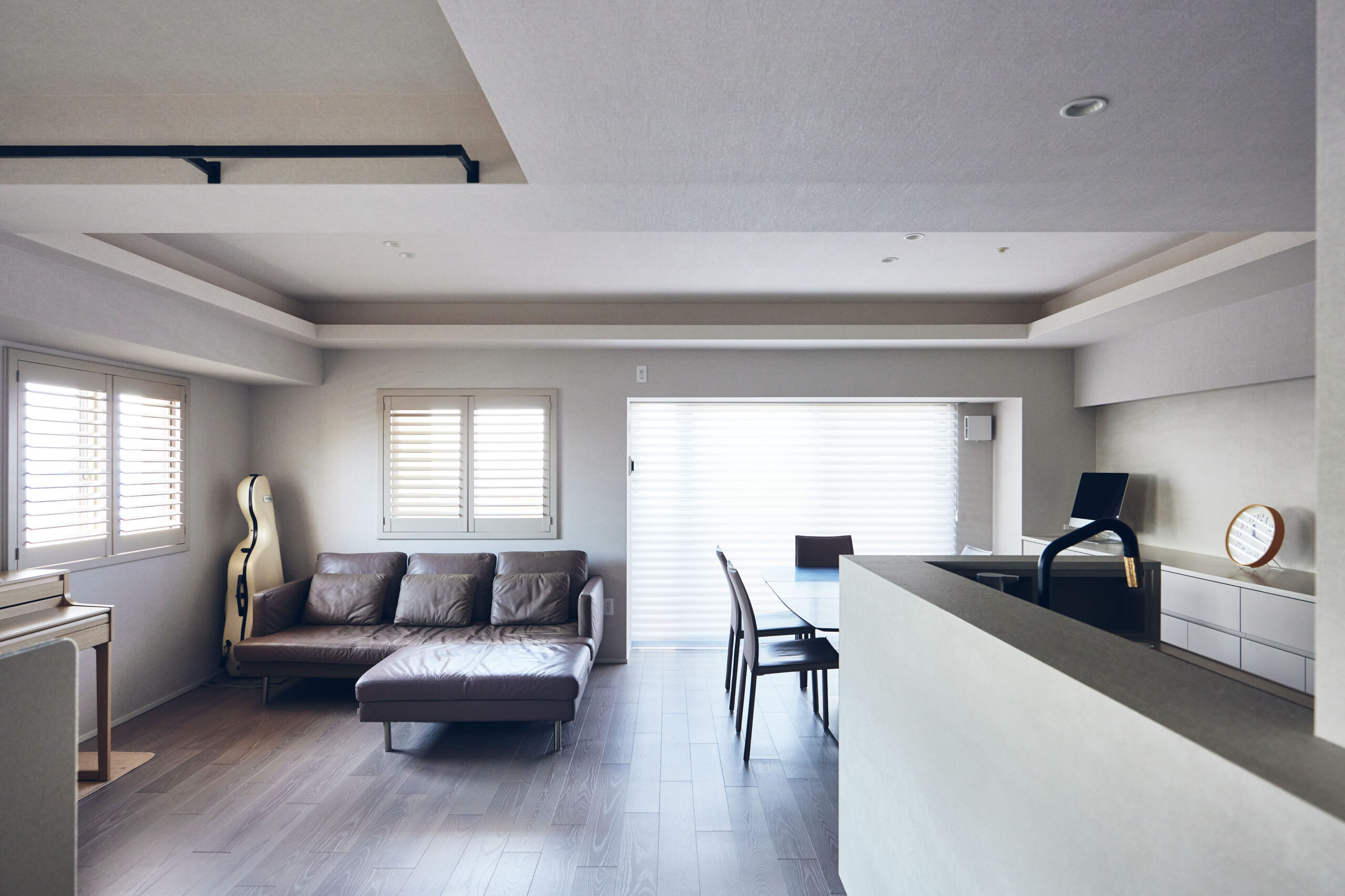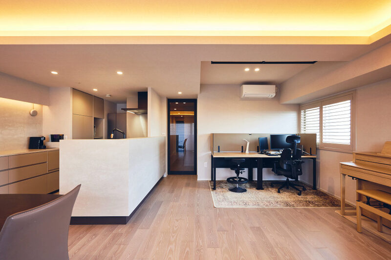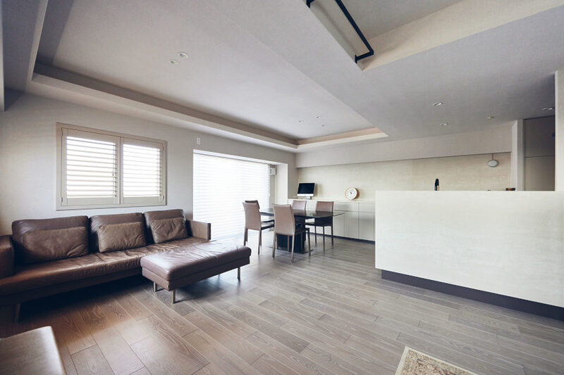 マンションの構造上、室内には梁がいくつもありました。Harikiさんの提案により、下がり天井を設けるなどして天井の高さを揃え、すっきりと整った空間を実現しました。リビング・ダイニングの下がり天井には間接照明も設けました。隣接するWIC内に配管を通すことで、エアコンも目立たない場所に設置することができました。