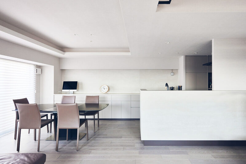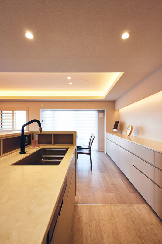 今の暮らしの不便を解消し、窓が多く眺めが良い、この部屋が持つ本来の魅力を最大限に活かすことを目指しました。アイデアを出し切ったところから、現実的なプランへとそぎ落していきました。 和室をなくして、約24帖の広々としたLDKが誕生。L型だったキッチンは向きを変え、田中工藝のペニンシュラ型のオーダーキッチンにしました。キッチンに吊戸棚は取り付けず、リビングダイニングが見渡せるようになりました。キッチンの背面には、同じく田中工藝で製作した収納がダイニング側まで続き、一体感のある開放的なLDKになりました。