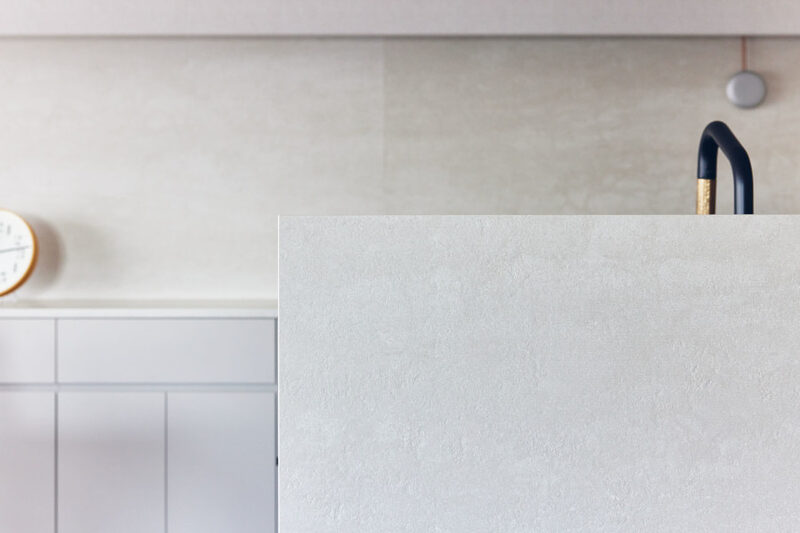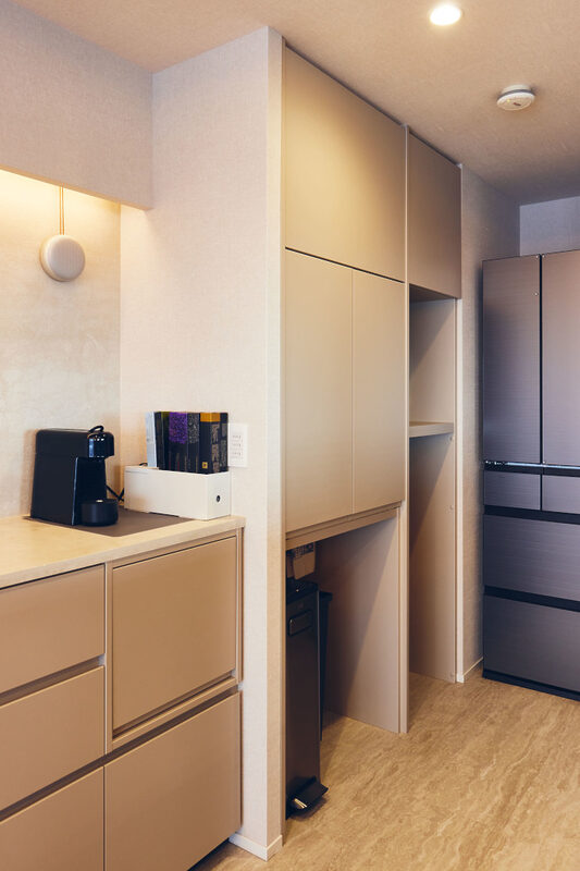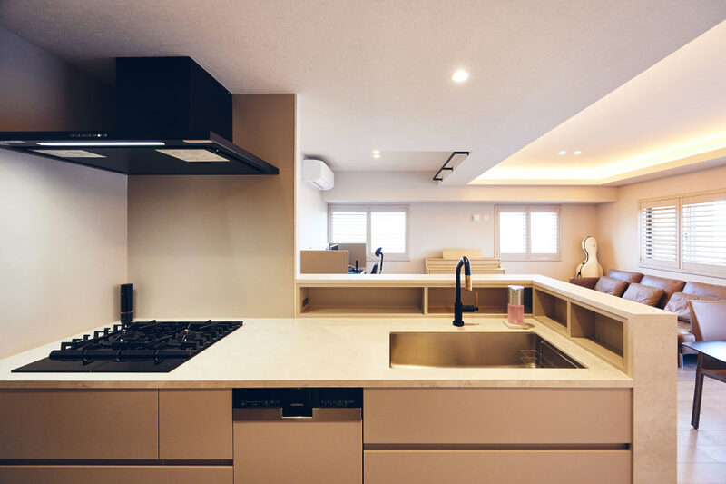 キッチンを囲む腰壁と背面の壁には、1枚が1m×3mという超大判タイルを採用。大きさが活きるようきれいに割り付けられています。 このタイルをはじめ、フローリングやクロス、建具など、全体のカラーリングも試行錯誤しました。単体のサンプルで気に入っても、全体で合わせると雰囲気が変わってしまうこともあり、何度もサンプルを見比べグレージュを中心にしたニュアンスカラーでコーディネートしました。