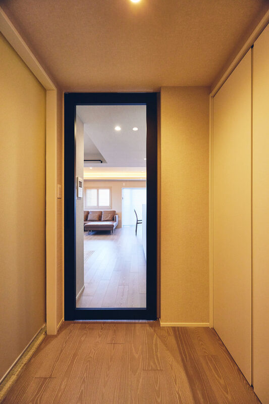 ショールームで見比べながら選んだKAMIYAのリビングドアは、ガラス面が大きく、天井まで高さのあるシンプルなデザイン。上吊り&引き込み式で、床面のレールや扉枠もありません。選べる取っ手の中に気に入るものがなかったため、壁の出幅を調整してもらい、扉を閉めるための手がかりを作ってもらいました。このように細かな点まで工夫していただいたことがとても嬉しかったです。