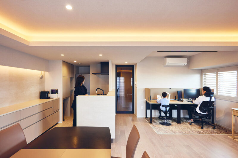 キッチンに立つと、ダイニングからリビング、ワークスペースまで見渡せます。並んだ窓からは景色も眺められ、心地よい気分になります。一日中、家で過ごしていてもストレスを感じず、朝食をゆっくりとっていると、まるでホテルや別荘にいるかのような非日常感も味わえます。夜は間接照明だけにして過ごし、廊下から扉のガラス越しに見えるリビングには温かな雰囲気が漂っていて、いつも「いいなあ」と感じ入っています。来客時は広い空間で子供たちを遊ばせながら、楽しんで過ごすことができました。