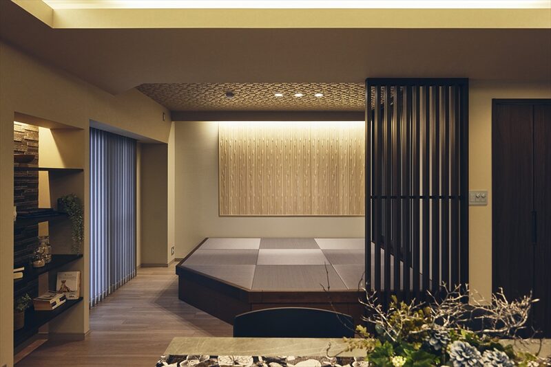 キッチンは以前と同じL字の配置ですが、周囲の壁をなくしてオープンに。逆にパントリーとの間には仕切り壁をプラスして、冷蔵庫やキッチン家電、食品類などの収納部分がダイニング側から見えにくくなっています。 隣接していた和室は、一部を格子で緩やかに間仕切りした小上がりに。床の角を斜めにカットすることで、洗濯物を干す時もバルコニー側へスムーズに移動できます。壁には縦の空間の広がりを強調するウッドパネルを張りました。