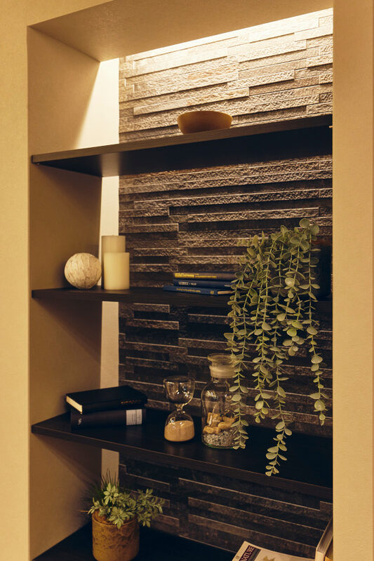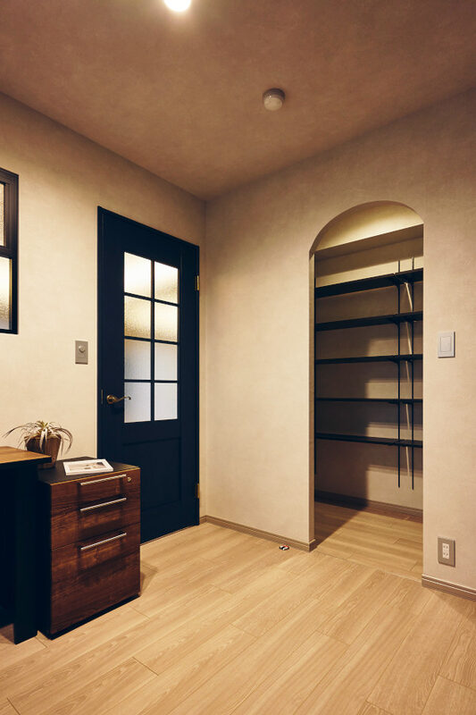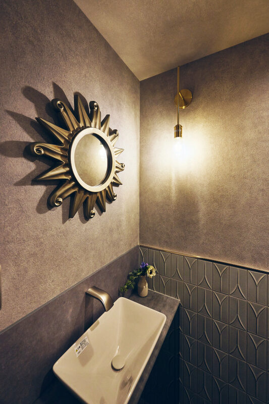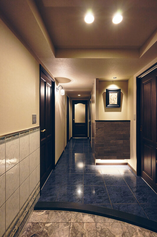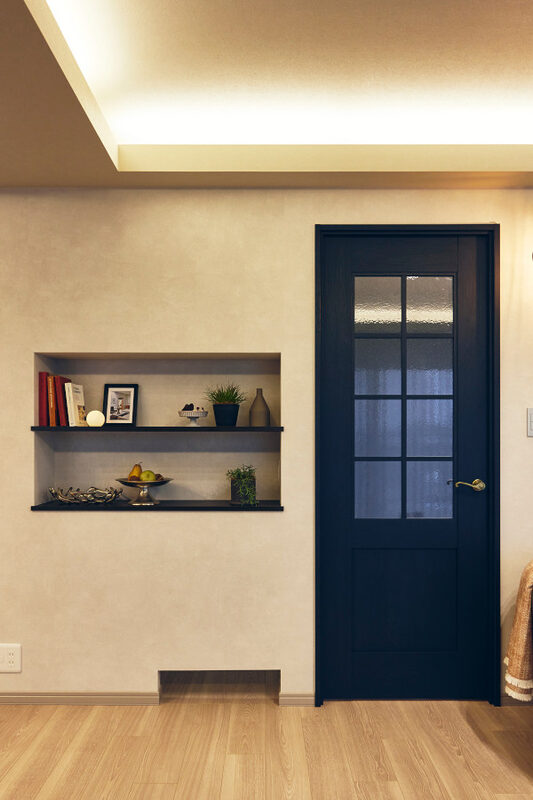 好きなテイストが幅広く、趣味もたくさんあるため、まとめるのは難しかったと思います。Konishiさんはテーマカラーを決め、私たちには常に3つ程度の選択肢を提案くださり、全体を整えてくれました。床や扉に使用したダークブラウンとタイル壁などのグレーをベースに、ブルーとゴールドがアクセント。キッチンの壁に採用した大判タイルは自然なムラのあるグレーで、立体感や高級感がありつつ、汚れが目立たない実用性も気に入っています。 リビングに面する書斎は、ネイビーブルーの扉と室内窓、ブラケット照明を組み合わせた空間イメージがまさに理想通りで、眺めているたびに嬉しくなります。ニッチもいくつかあり、コーナーごとに好きなものを飾っています。LDKや和室はモダンな雰囲気ですが、玄関周りや廊下は、既存のタイルや大理石に合わせてクラシックな雰囲気に仕上がりました。