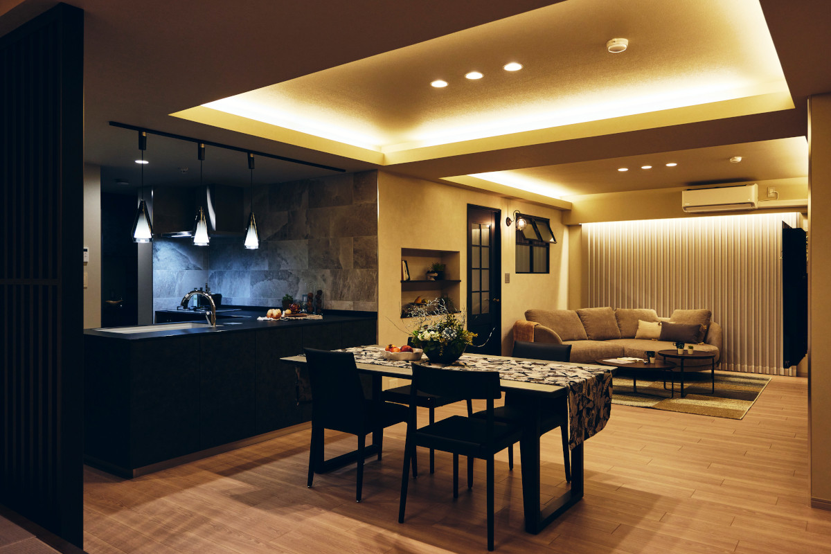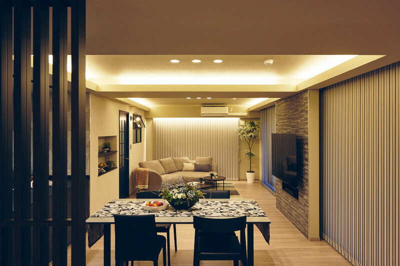 圧迫感のあったリビング・ダイニングは、数々の工夫で広がりのある空間に生まれ変わりました。目立っていた梁は、下がり天井と間接照明を設計してもらい、柔らかな光と影の立体感で高さを感じさせる空間になりました。フローリングの張り方は入った時に奥行を感じる方向とし、掃き出し窓は縦型ブラインドを取り付けることで実際の窓より大きく感じられ、天井も更に高く見えます。