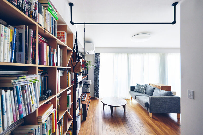 お仕事柄、書籍を多く所有されていることから、大容量の本棚とワークスペースを計画。本棚はあえて雑多に見せてインテリアの一部としました。