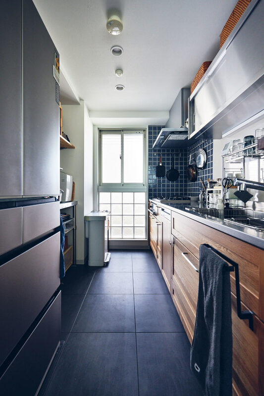 キッチンのステンレス天板やタイル壁、リビングの本棚背面のコンクリート仕上げでビンテージテイストに。床材・建具、通路のデザインパネルは天然木目の表情が豊かな素材を採用し北欧風に。様々なマテリアルの個性をバランスよく織り交ぜた空間に仕上げました。