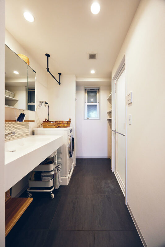 洗面カウンター+モザイクタイル+小物が置ける木カウンターでオリジナルの洗面台を造作してデザイン性を追求。ご主人様こだわりのミーレ製洗濯機を設置し、室内干しやオープンでありながら入口からは見えない収納棚など機能面も兼ね備えた洗面室となりました。