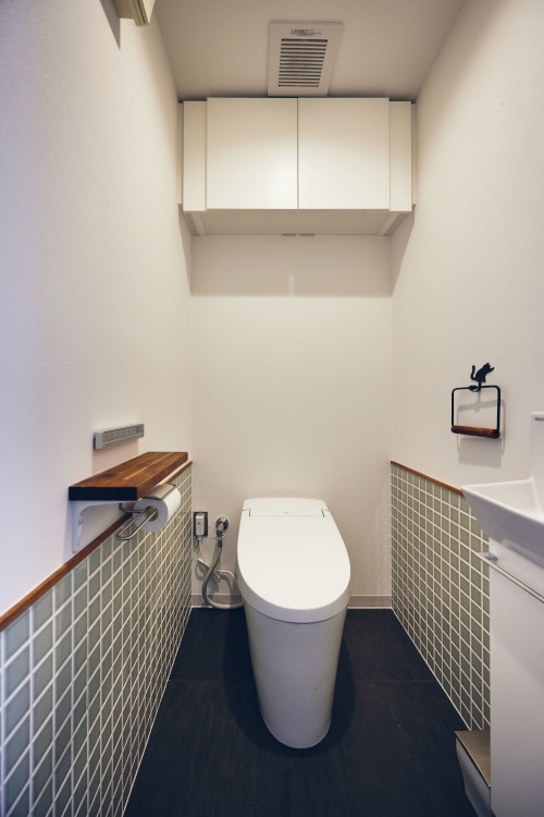 Y様が大好きなセレクト品を取り扱うtoolboxの扉やタイル・スイッチ・ハンガーパイプなどをたくさん取り入れました。気に入ったデザインのリビングドアに合わせて、扉枠を造作し、塗装を施しました。