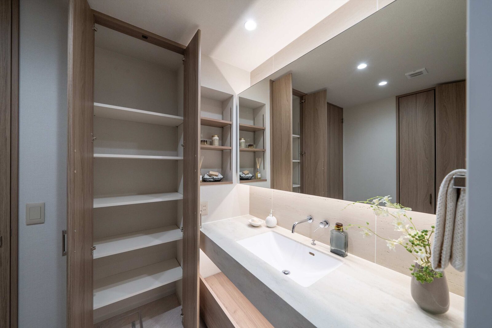グレージュを軸にしたニュアンスカラーで空間全体にまとめることで、落ち着きを演出。