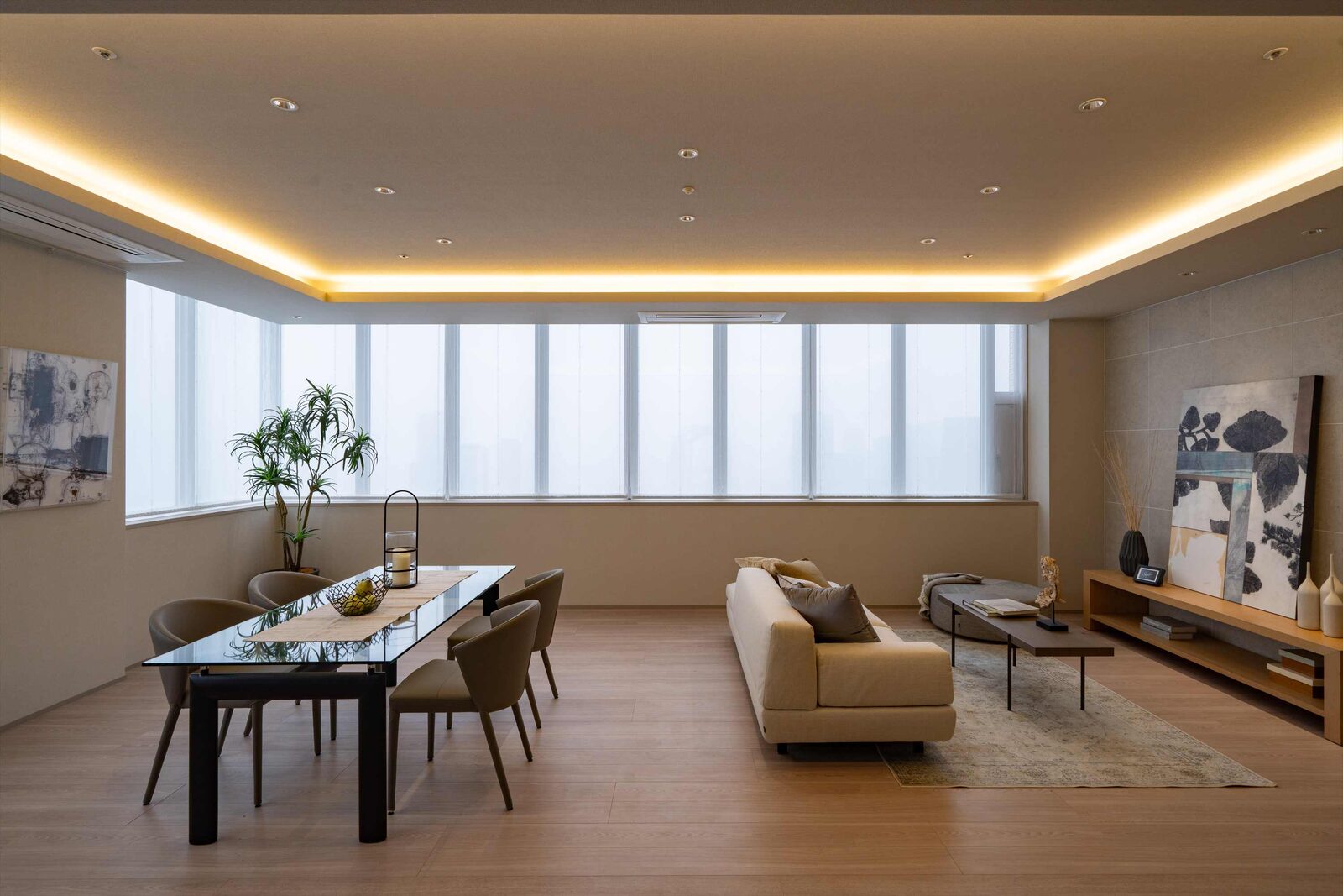 「空の蒼、鮮やかな夜景」など、大きな窓から見える眺望の色彩が映えるよう、引き算の設計をしました。