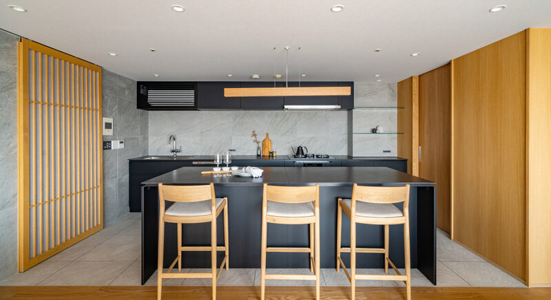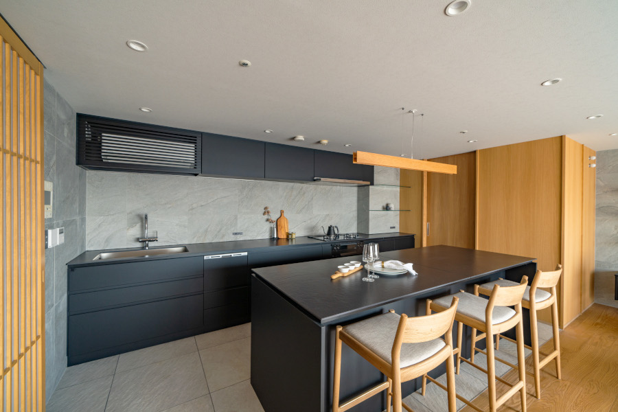 料理を愉しむだけではなく、デザインとしても存在感のある黒いキッチンは田中工藝の作品。