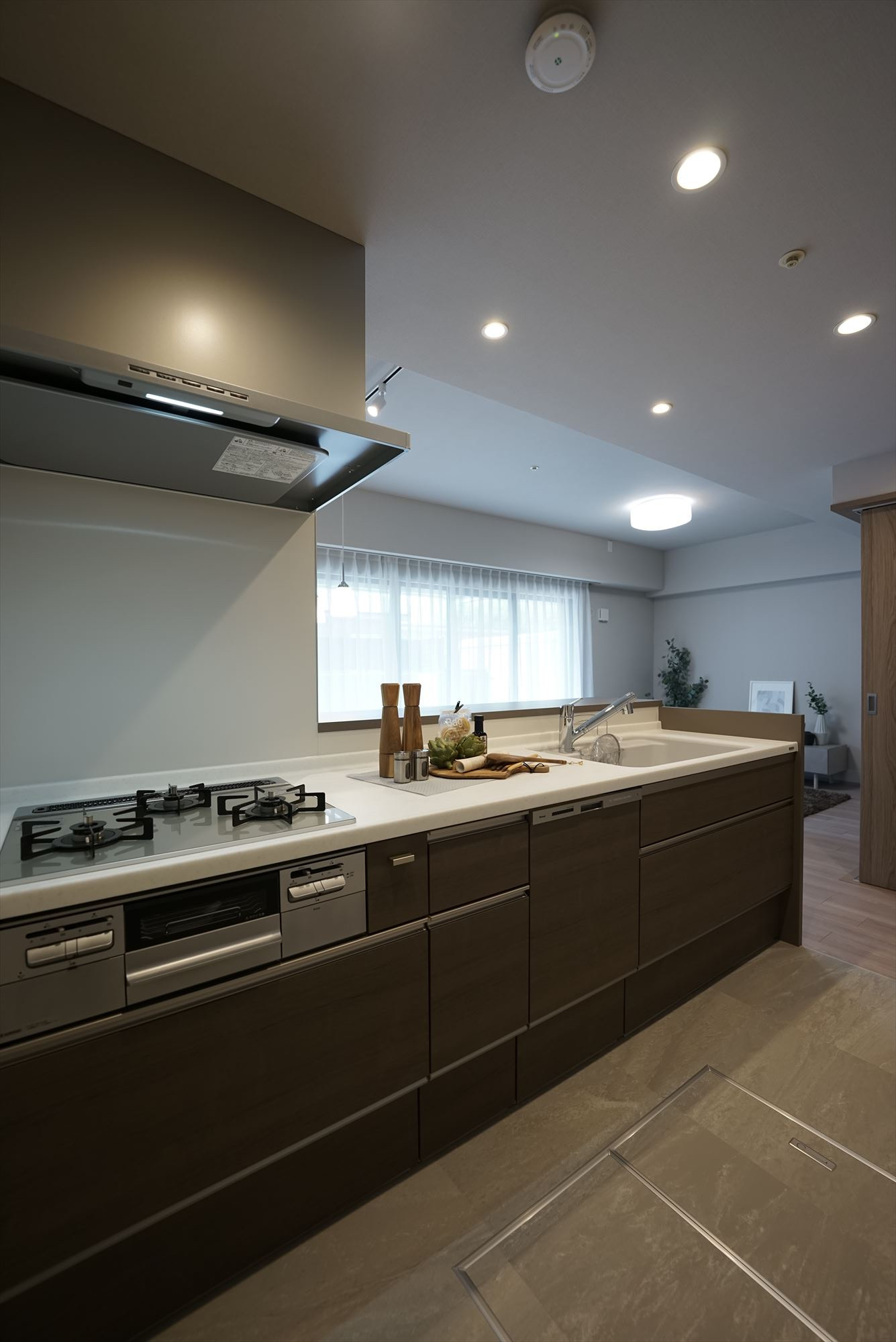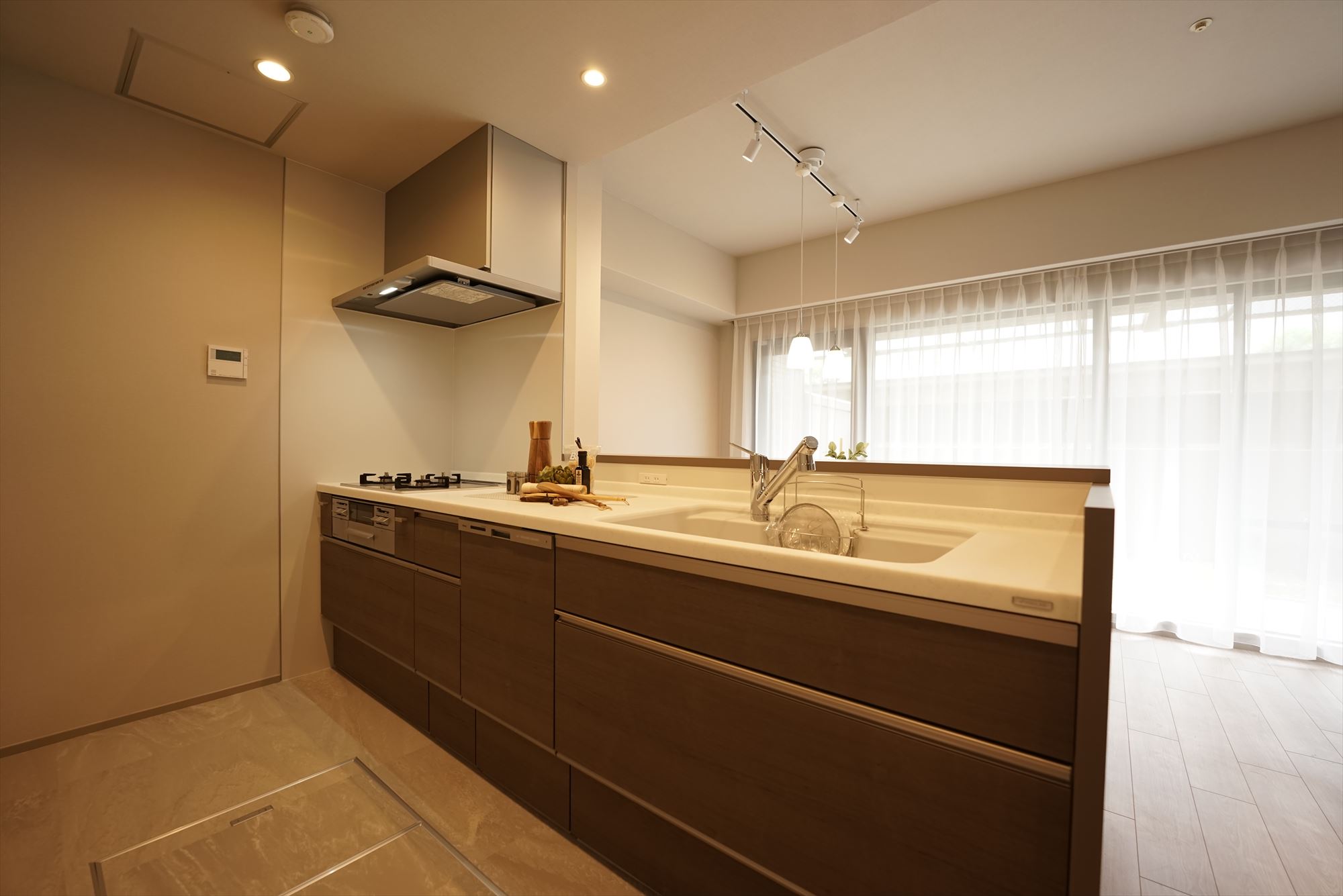 • キッチンに立てば、大きな窓越しに専用庭の緑と、