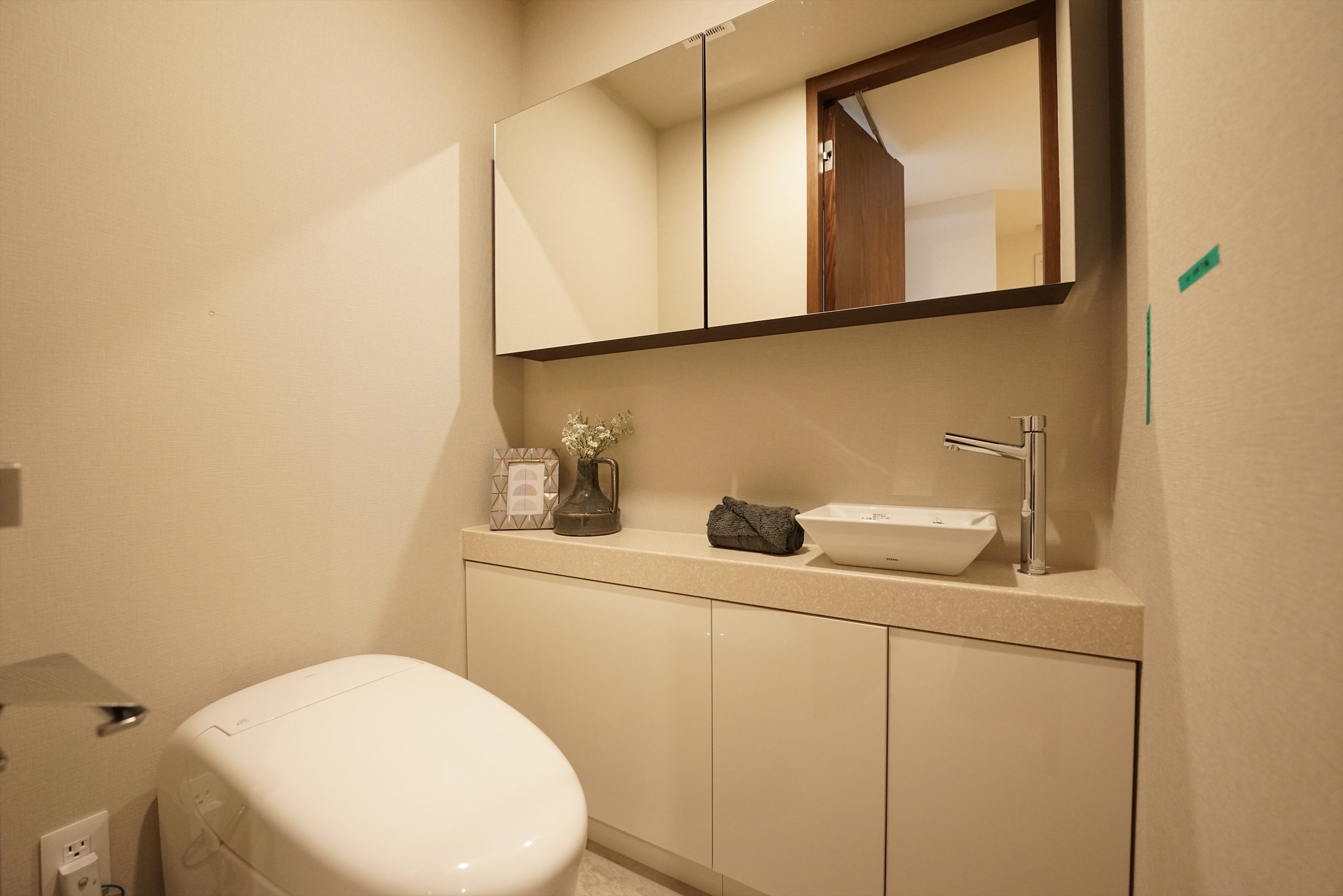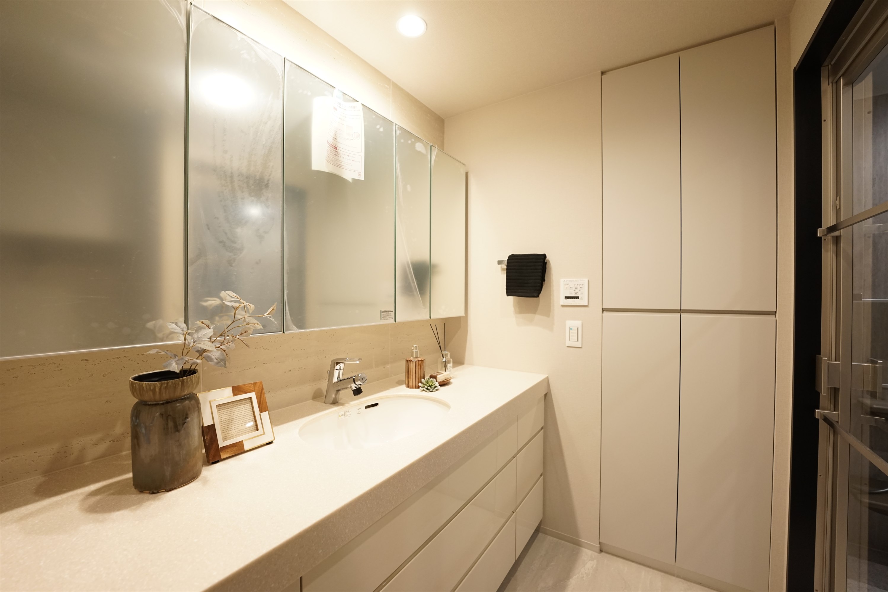 • 幅広の洗面カウンターと、やわらかな光を宿す三面鏡。