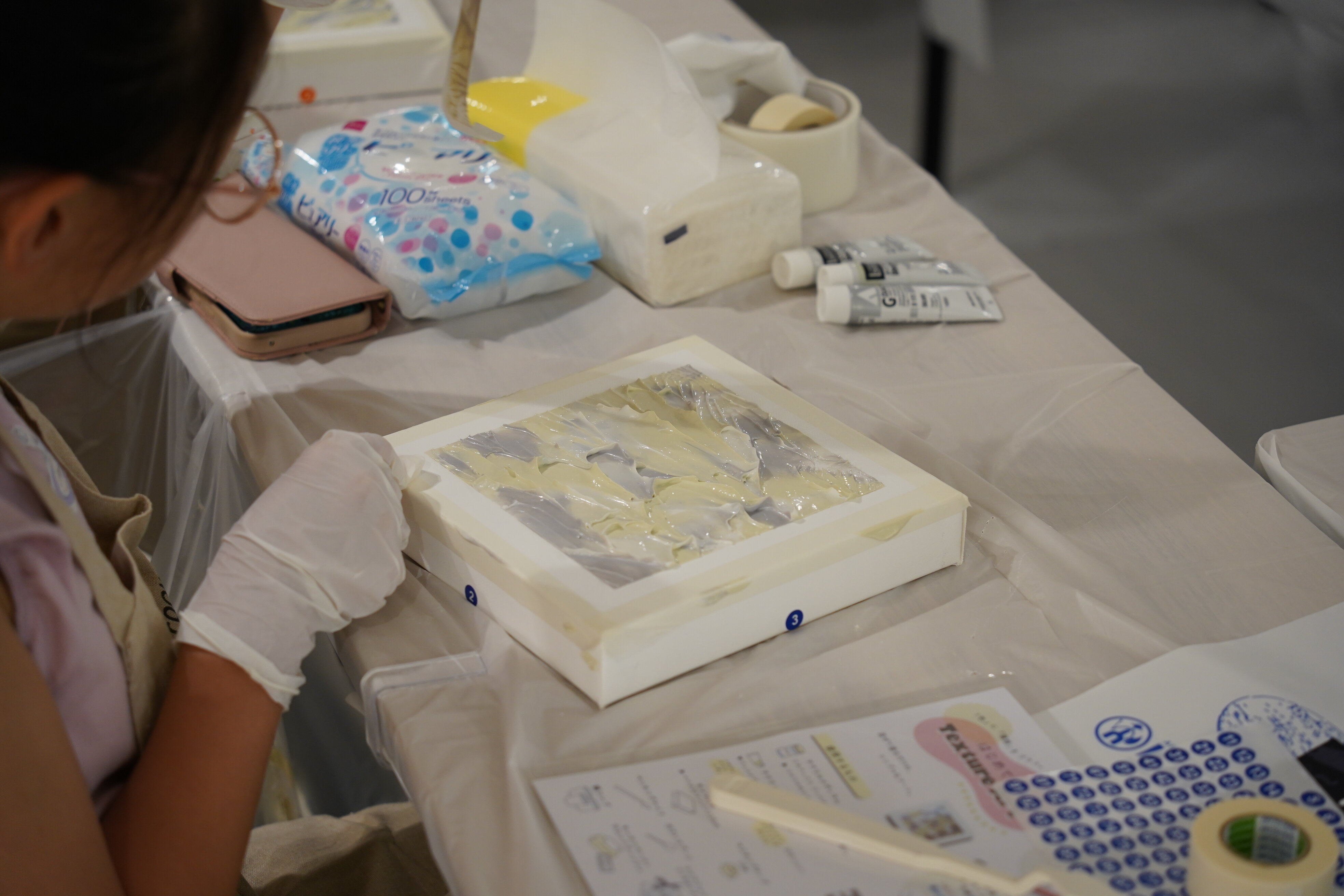 絵具を自由にキャンバスにのせていただき、シートで押さえることで、味わい深いテクスチャーを表現します。